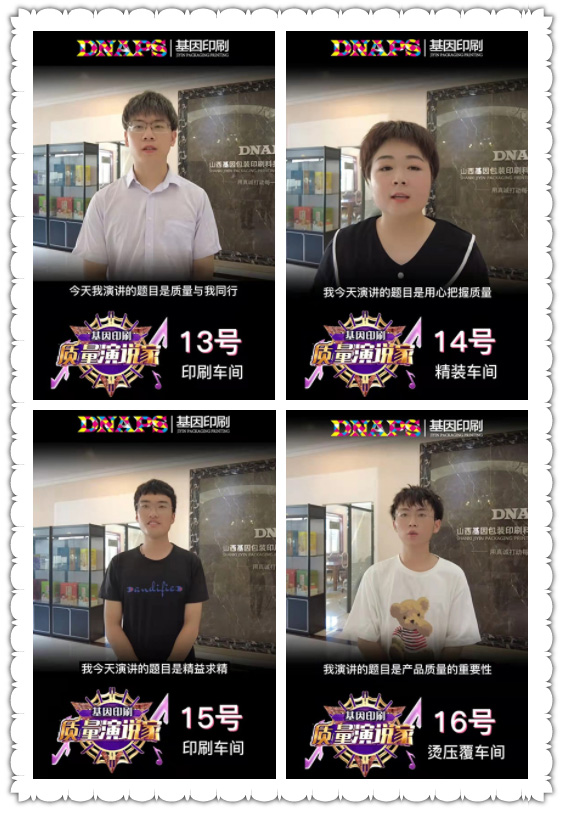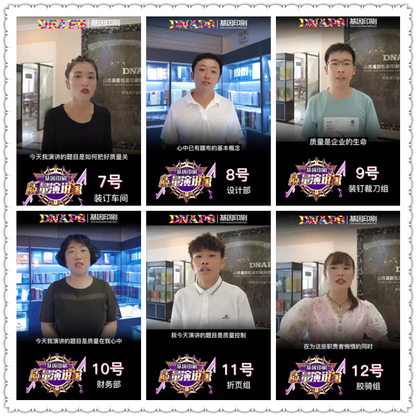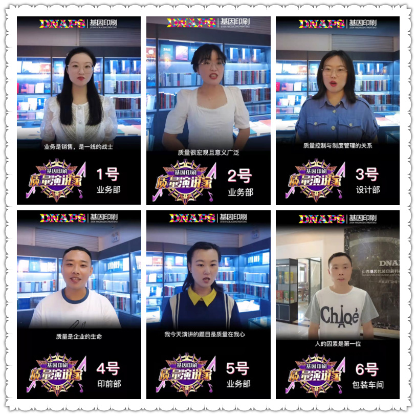 為了讓“質(zhì)量”意識(shí)深入人心,基因印刷組織了一場(chǎng)別開(kāi)生面的“質(zhì)量演說(shuō)家”演講比賽。負(fù)責(zé)人積極商討比賽形式,最后決定通過(guò)視頻錄制的形式公開(kāi)發(fā)布在線上請(qǐng)客戶(hù)和全體員工投票。票選出的優(yōu)秀代表在本周六的質(zhì)量大會(huì)上進(jìn)行現(xiàn)場(chǎng)的演講。新穎的比賽形式激發(fā)了全體員工的熱情,各部門(mén)員工踴躍參與,利用早會(huì)和空余時(shí)間進(jìn)行練習(xí)和彩排,最后共有16人脫穎而出。不同部門(mén)的員工從不同的角度詮釋了自己對(duì)“質(zhì)量”的理解,一遍遍的練習(xí),一遍遍的重復(fù),不僅演講人自己,聽(tīng)的人也在不知不覺(jué)中對(duì)“質(zhì)量”有了自己的思考。